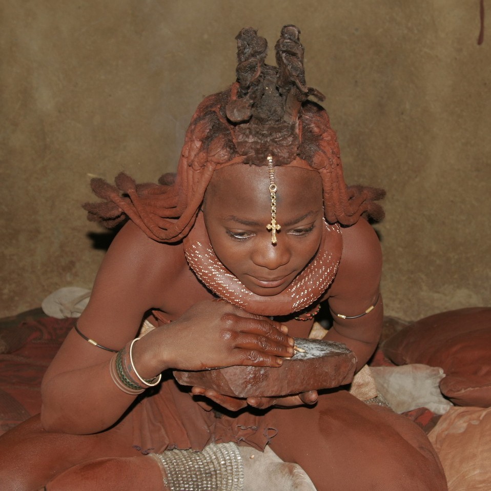A visit to Namibia offers the chance to encounter the striking Himba women, celebrated for their sculpted beauty and reddish skin and hair. This unique hue comes from an ochre mixture they apply to their bodies and hair. Their elaborate hairstyles and adornments – necklaces, bracelets, iron belts, and cowrie shell beads – tell a story of a woman’s life, if you know how to read it. Married women wear leather headdresses made from goat hides. Due to the scarcity of water, Himba women “bathe” in smoke. And they are very secretive about a certain part of their bodies. You have to go see it to understand.