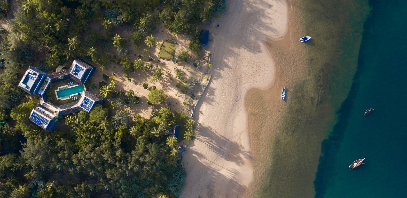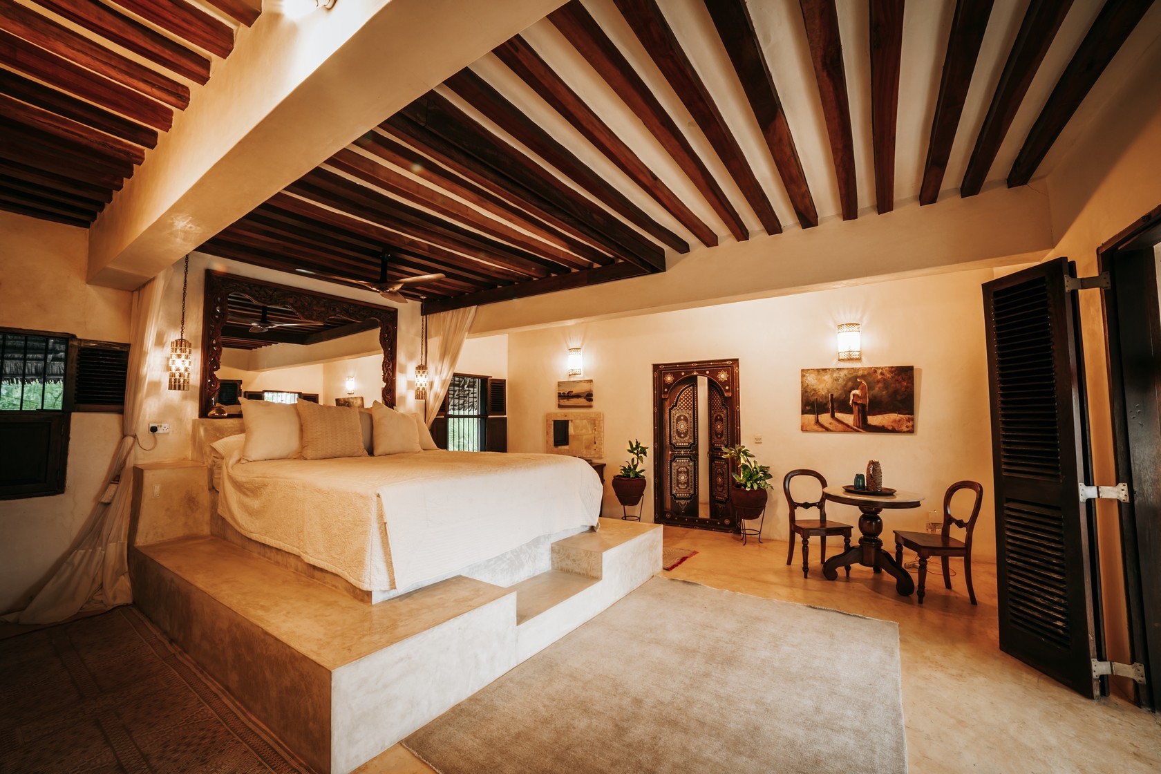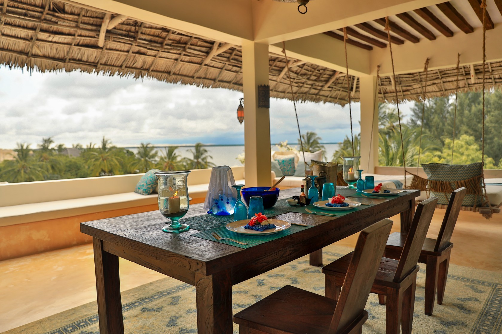 Dining at Kaskazi is an experience in itself. Local, hand-blown glass tableware and lavish, Eastern-inspired place settings. Your personal chef will whip up whatever your heart desires. Enjoy breakfast poolside, lunch in the cool shade of the trees on the beach, and dinner on the third-floor open terrace, gazing at the breathtaking tropical starlit sky. Kaskazi boasts five spacious bedrooms, each with a luxurious en-suite bathroom and a shaded terrace, plus two kids’ rooms with a large shared bathroom. The primary bedroom is an Eastern potentate’s fantasy: a bed the size of a football field, topped with a magnificent canopy; a sprawling terrace with ocean and pool views; and a cozy open-air bath.