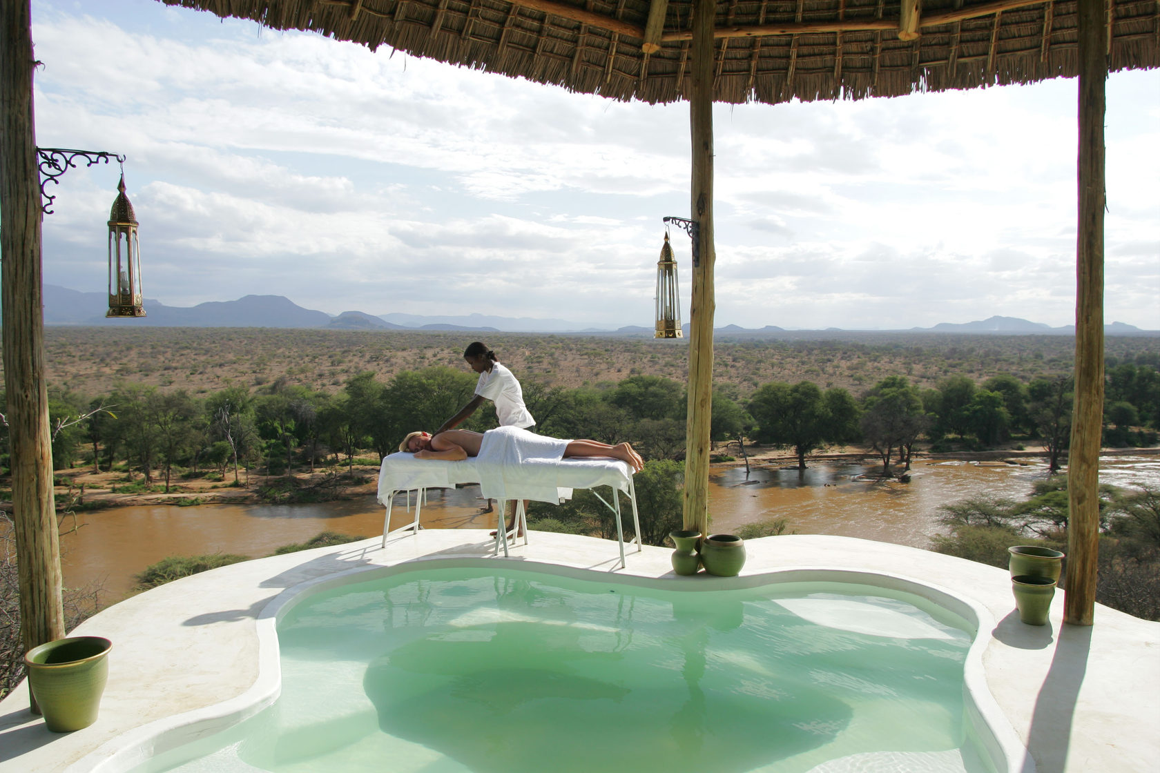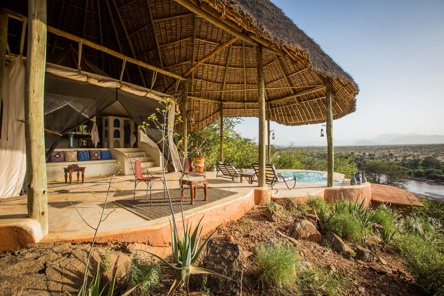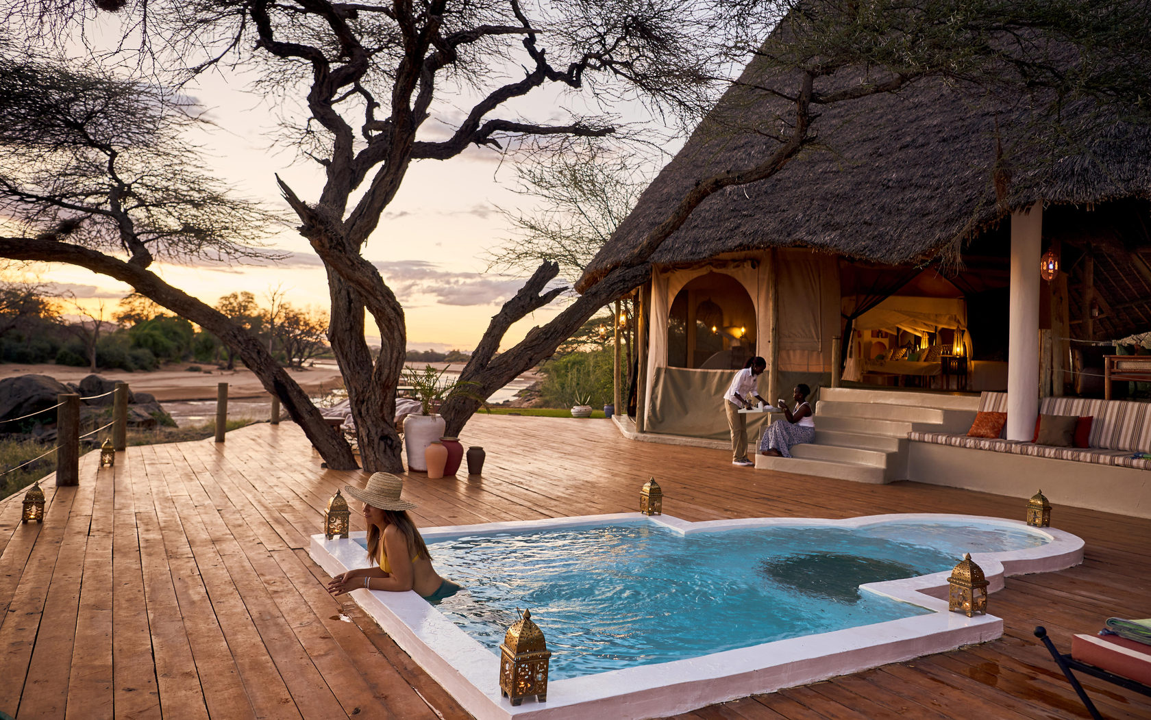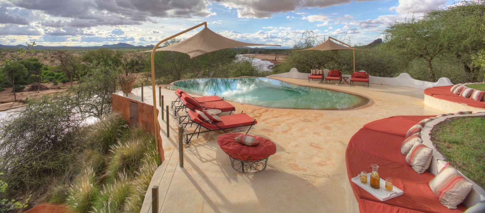 Nestled along the banks of the Ewaso Nyiro River, within the private Westgate Conservancy and bordering Samburu National Park, you’ll find the opulent Sasaab lodge. Each of its nine suites boasts a unique, Moroccan-inspired design. Every suite also features a private, open-air veranda with its own plunge pool. And let me tell you, the views of the Laikipia Plateau and elephants making their way down to the watering hole are breathtaking.