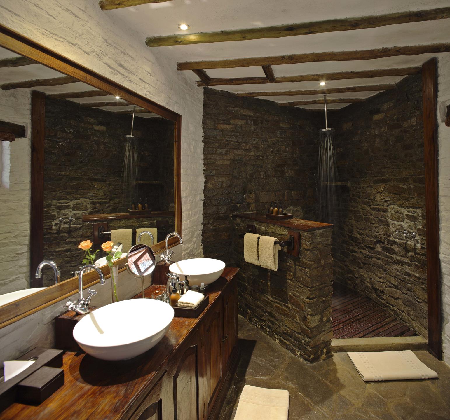 Whitewashed walls built from local stone, thatched palm-leaf roofs, polished wooden floors, understated yet cozy interiors, and a spacious veranda with a fireplace and comfortable armchairs – all overlooking a stunning green river valley and the wooded hills beyond.