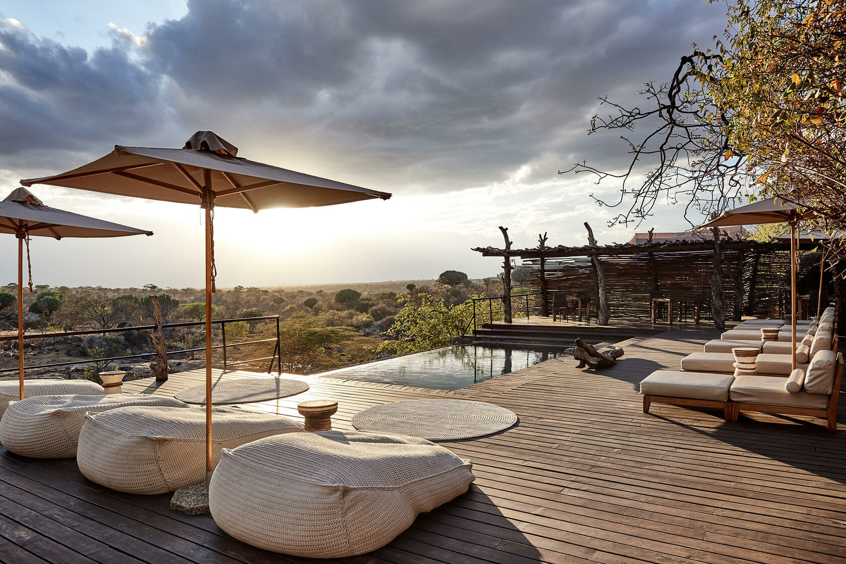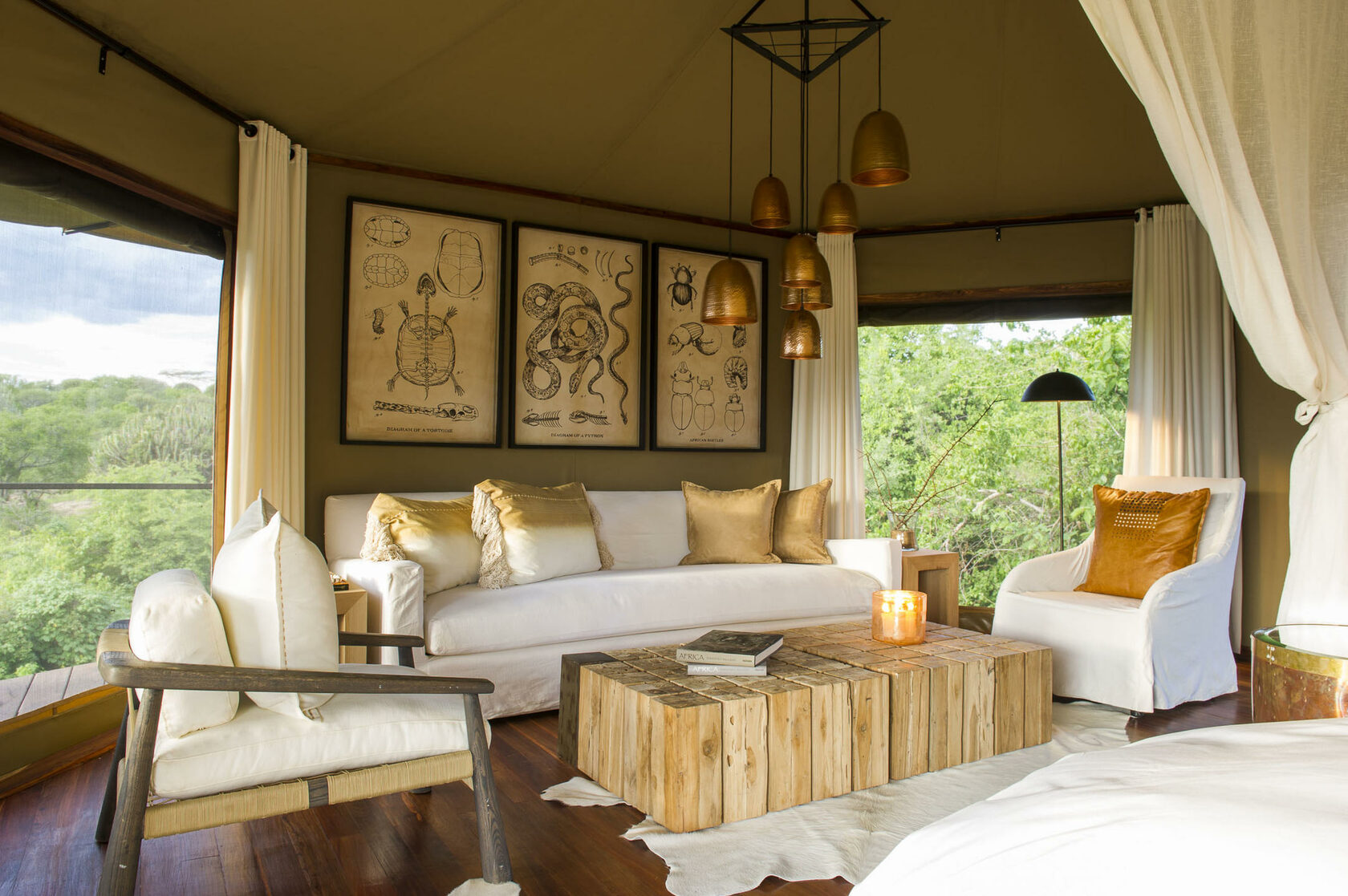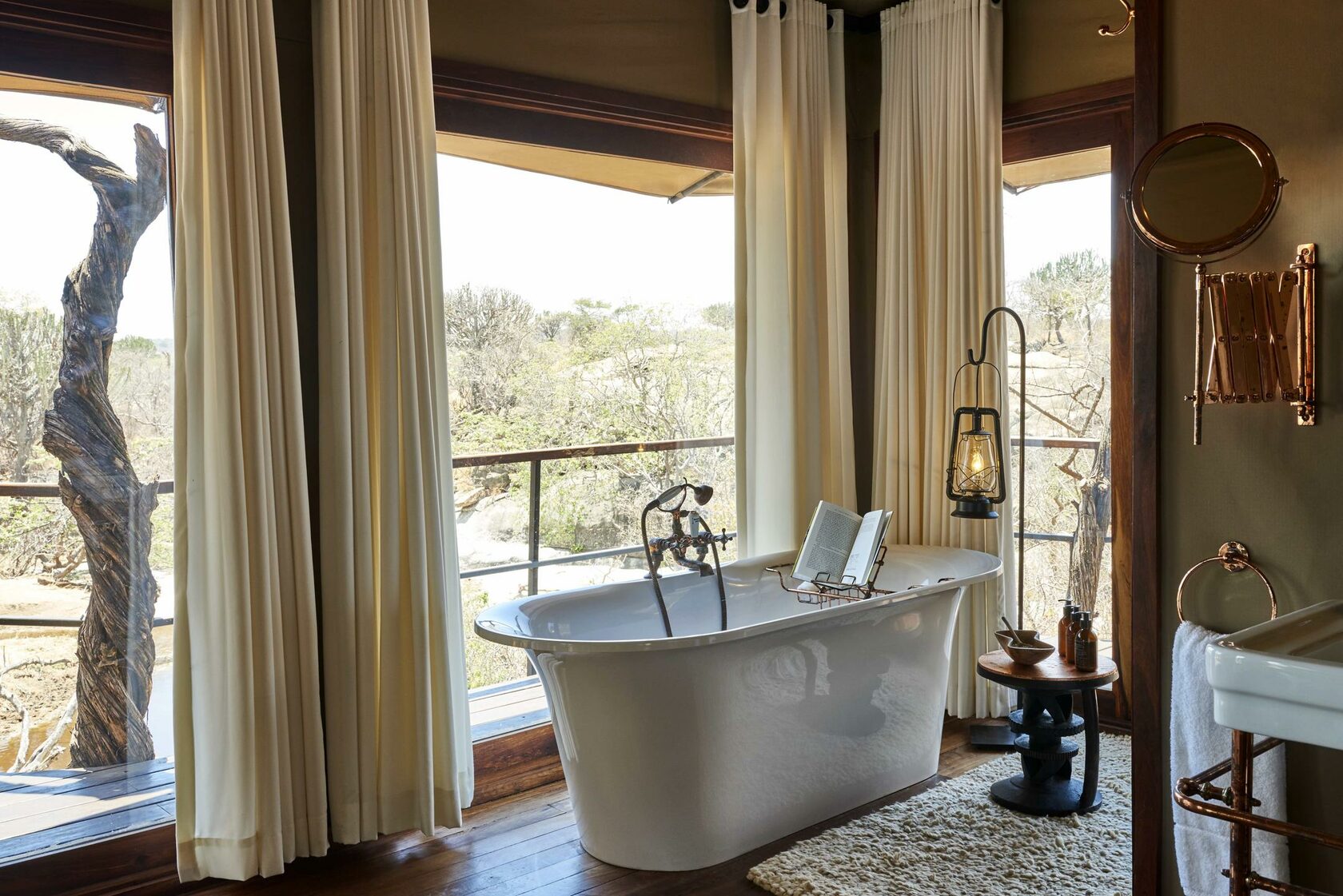 A sprawling infinity pool perches on a rocky outcrop, providing a bird’s-eye view of animals making their way to the watering hole below. If you’re lucky, you might witness a lion ambushing a zebra or antelope. For those who prefer to soak in the spectacle solo, each suite features a private terrace.